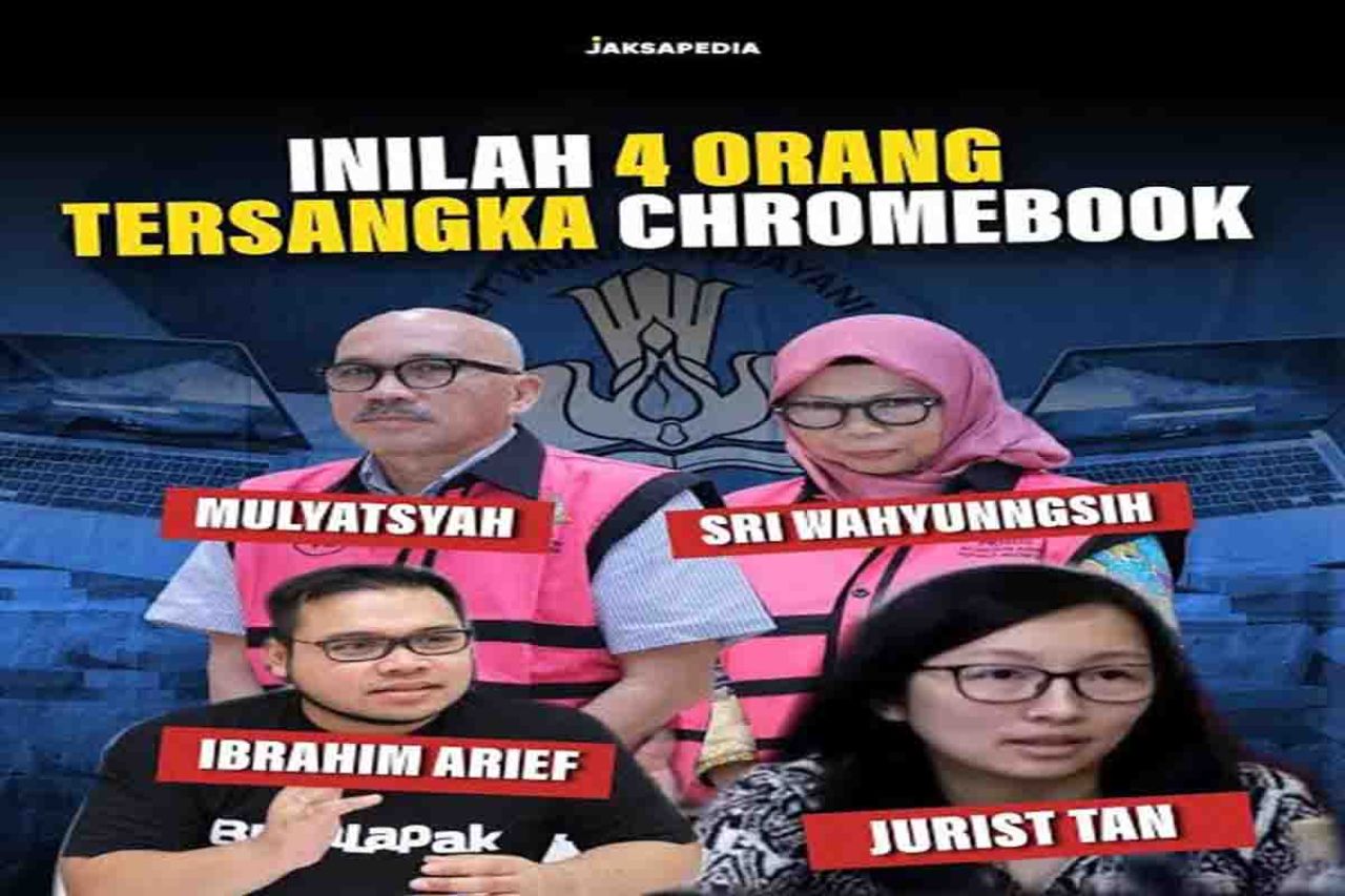 Kini Kejaksaan Agung (Kejagung) sudah mencokok 4 nama dalam perkara korupsi pengadaan Chromebook tahun 2020-2022. Mereka, antara lain adalah Sri Wahyuningsih, Direktur Sekolah Dasar Ditjen Pendidikan Anak Usia Dini, Pendidikan Dasar & Menengah periode 2020-2021; dan eks Staf Khusus (Stafsus) Nadiem Makarim, Jurist Tan.