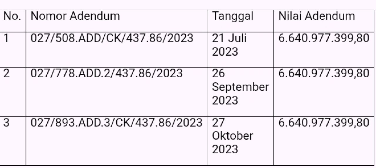 Dalam pelaksanaan pekerjaan Perampungan (Finishing) Bangunan Masjid Islamic Center dan Prasarana Lainnya, antara CV Eka Jaya Abadi dengan PPK mengalami 3 (tiga) kali adendum, dengan rincian :