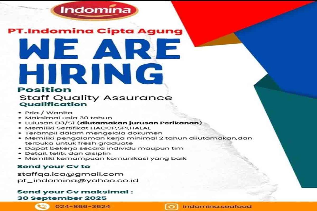 PT Indomina Cipta Agung membuka lowongan kerja dengan posisi sebagai Staf Quality Control Assurance.
