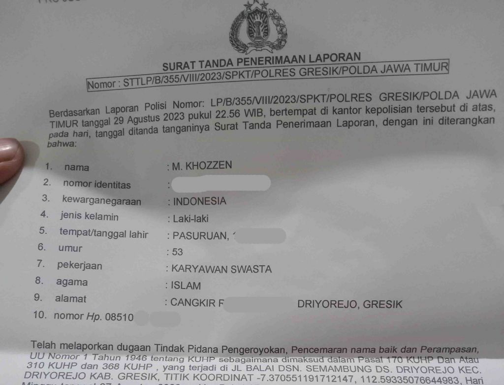 Kepolisian Resort (Polres) Gresik mulai menyelidi kasus dugaan tindak pidana pengeroyokan disertai perampasan dan pencemaran nama baik yang terjadi di Desa Driyorejo, Kecamatan Driyorejo, Kabupaten Gresik, Provinsi Jawa Timur. Korbannya ialah M. Khozzen, warga Desa Cangkir, Kecamatan Driyorejo, Kabupaten Gresik.