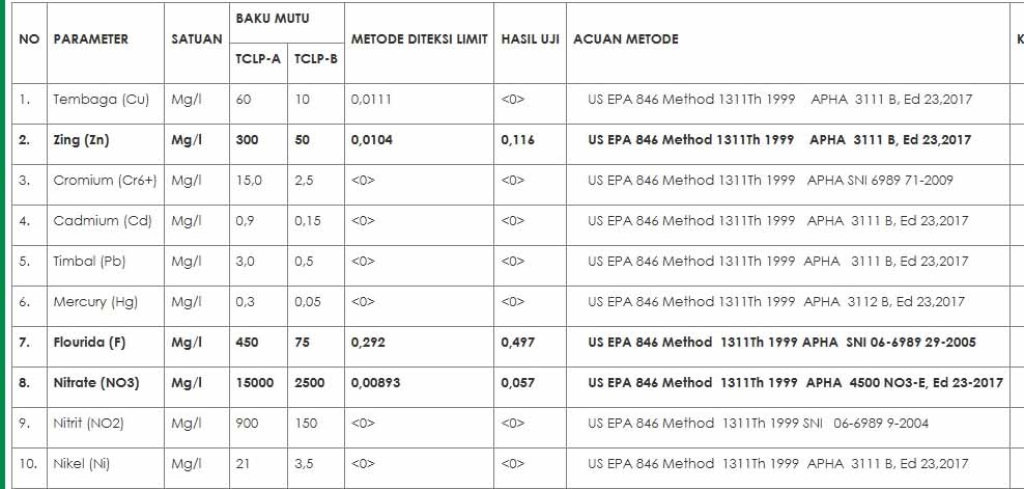 Berdasarkan hasil Pengujian sampel sebagaimana Sertifikasi Hasil Pengujian nomor : 660/C3102051224/111.6/2024 tanggal 30 Desember 2024, limbah padat yang diduga bottom ash dan fly ash yang diambil dilokasi PT Indonesia Celullar Concrete, pada koordinat S 07*24’43.260”, E 112*31’53.422”