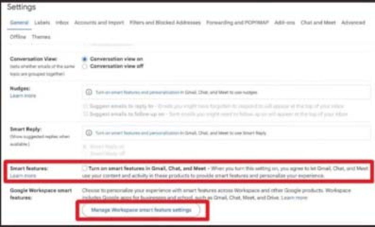 Hapus centang pada kotak untuk menonkatifkan fitur pintar. Hal ini mencegah AI menganalisi konten Gmail Drive, dokumen, dan layanan lainnya.