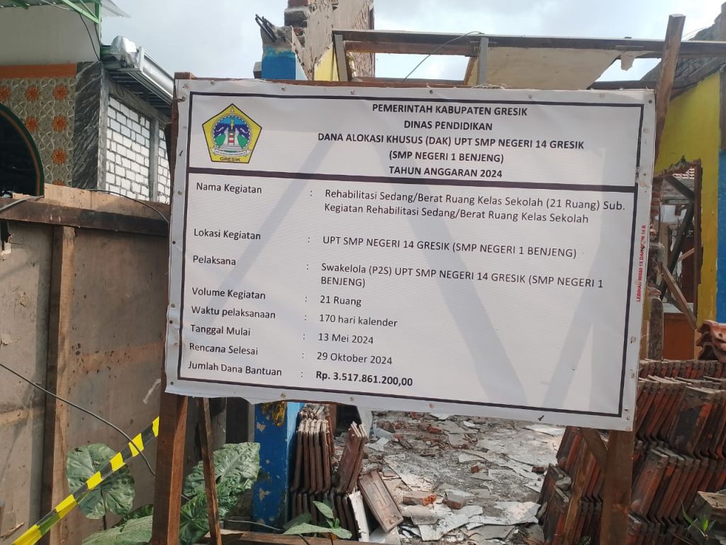 Unit Pelaksana Teknis Sekolah Menengah Pertama Negeri (UPT SMPN) 14 Gresik atau SMPN 1 Benjeng pada tahun 2024 ini digelontor anggaran Dana Alokasi Khusus (DAK) Fisik yang jumlahnya disebut “wow”. Tidak heran apabila sekolah yang beralamat di Jalan Raya Dermo nomor 5, Desa Dadapkuning, Kecamatan Benjeng, Kabupaten Gresik, tersebut melaksanakan beberapa pembangunan fisik.